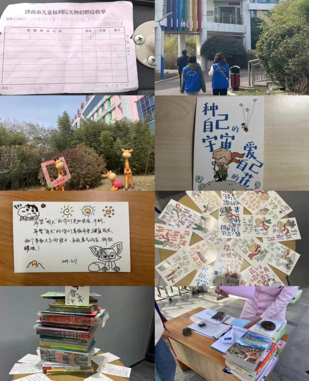 3.17日,志愿者们前往济南市儿童福利院进行“学雷锋志愿活动”,因为福利院儿童的特殊性,院方没有让志愿者们直接地接触小朋友们,志愿者们便每人在明信片上写下了自己对小朋友们的关心与美好祝愿,同时准备了75本课外书籍,捐赠给福利院,希望这些书籍可以带给他们一些开心的时光。