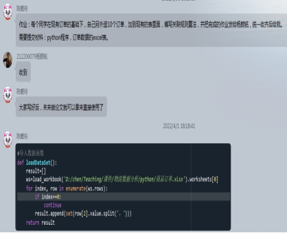 陈爱玲副教授运用腾讯会议投屏、QQ群同步作业考核等多种互动方式,将复杂的Python程序一步一步地分析、解构,并结合到实际应用场景讲解,进一步激发了学生兴趣,使课程保持极高的活跃度。同时,陈老师严格把控过程考核,利用QQ群布置课下作业,引导学生独立思考,夯实基础,学会与实际应用场景相结合;利用线上教学的独特优势,邀请物流领域数据分析专家为学生们开展线上课程并进行互动交流。