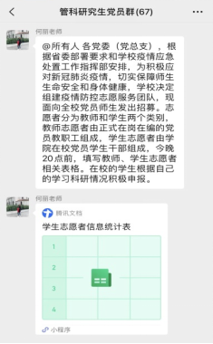学生们积极参与线上课程的学习,认真听课,遵守课堂纪律,并与老师在线上积极互动,学与思相结合。研究生阶段更加注重自主学习,学生们结合自身情况制定了详尽的学习计划、不断提升自主学习、科研创新能力,及时完成各项任务,保证学习成果。学生们加强与导师的线上沟通交流,坚持学术研究工作,潜心投入到学术研究工作中。同时,学生们克服万难,继续参与推进各项创新实践活动。各学生党员、学生干部敢为人先,充分发挥先锋模范作用,积极投入到校园防控的志愿服务工作中。