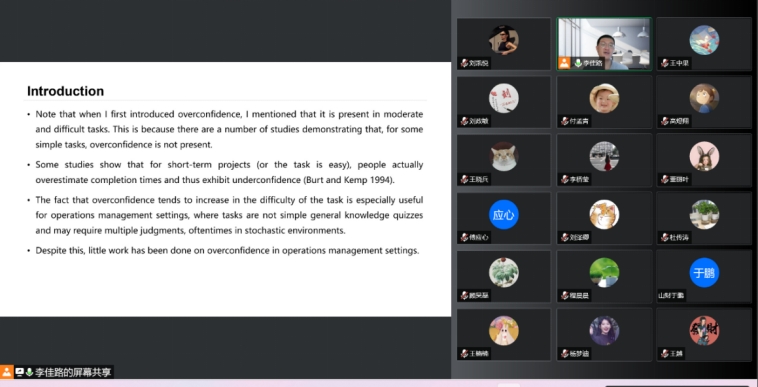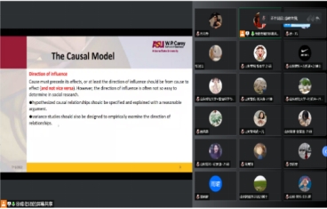 本次研究生暑期国际学校采用线上方式,邀请了佛罗里达州立大学商学院卢冠一副教授以及我院李佳路、徐峰和洪志娟三位青年骨干教师,采用英文教学方式,围绕实证研究方法、行为运营管理、因果推断等领域的前沿研究内容进行学术交流。佛罗里达州立大学商学院卢冠一副教授针对实证研究方法进行了系统性介绍,从实际问题出发,介绍了实证研究方法的发展、研究设计结果总结、解决内生性和基本计量经济学分析等;李佳路老师系统介绍了行为运营管理的研究现状、运营管理与行为研究的结合方式以及行为运作管理的研究范式,介绍人员试验作为研究方法揭示人类行为的研究机制,并结合“过度自信”、“预期后悔”以及“狼来了效应”提出行为运作管理未来研究的基本思路;徐峰老师主要介绍了因果关系模型的要素和研究设计,分析了内生性影响因果推断的生成原因,详细讲解了工具变量,双重差分(DID)及倾向得分匹配等克服内生性问题的研究方法,最后以ISR期刊上的论文为范例说明如何在实际研究中建立有效的因果推断;洪志娟老师针对技术经济学领域的资金时间价值,详细阐述了现金流量的分类及各类型下的资金等值计算问题。四位授课老师充分利用了腾讯会议的平台功能,和学生们进行了积极互动交流,既活跃了课堂气氛又保证了授课质量。暑期国际课程结束后,我院同学进行了课程回顾并完成了课程报告总结,同学们高度认可此次暑期国际学校的培训价值,认为在此次暑期国际学校中受益匪浅,通过此次学术活动,有助于树立更高的学术思想,形成更宽的学术视野,掌握更好的科研方法并形成更优的科研与生活习惯,并为研究生期间的学术旅程增添一抹亮色。
