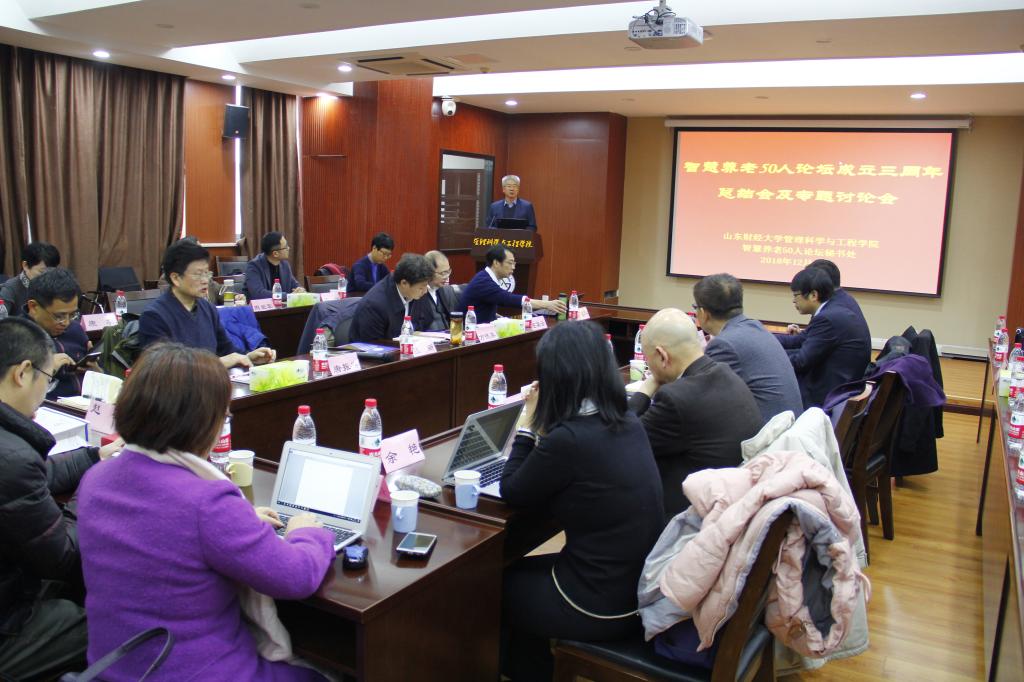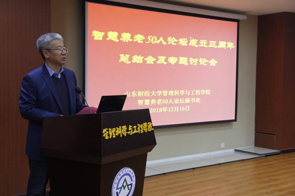 2018年12月14-15日,“智慧养老50人论坛”在山东财经大学隆重召开,本次论坛由管理科学与工程学院承办。论坛围绕中国智慧养老的发展问题,聚焦“智慧养老与智慧医养课程体系建设、智慧养老与智慧医养项目评估、智慧养老三年来进展回顾”等三个主题进行了深入讨论与交流。山东财经大学副校长、论坛轮值主席张新、中国人民大学智慧养老研究所研究员褚晓峰共同主持了本次论坛报告。论坛成员、企业代表、管理科学与工程学院师生50余人参加了此次会议。