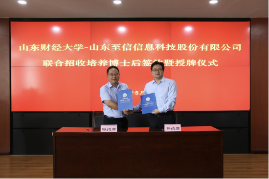 2025年5月15日,山东财经大学与山东至信信息科技股份有限公司联合招收培养博士后签约暨授牌仪式在燕山校区成功举行。山东财经大学人才工作办公室主任刘淑芳、管理科学与工程学院党委书记崔东峰、院长刘位龙、副院长王洪海、泰山学者关洪军、学院办公室主任孙涛,山东至信信息科技股份有限公司总经理张文龙、人力资源总监张茂亭、企划总监贾艳娇和行政经理张迟共同出席了此次仪式。
