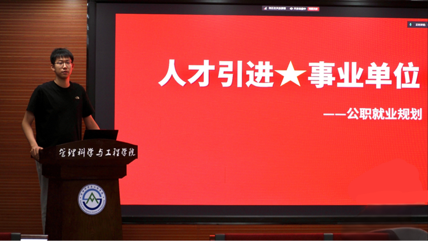 随后,三位优秀的学长学姐依次上台,分享了他们的就业经验和心得体会。信管2102成功上岸选调生的李彦臻同学分享了备考选调生的过程和经验,包括如何制定学习计划、如何选择报考岗位、面试的技巧和注意事项等。她强调,备考选调生需要长期的积累和坚持,要注重提高自己的政治素养和综合能力。