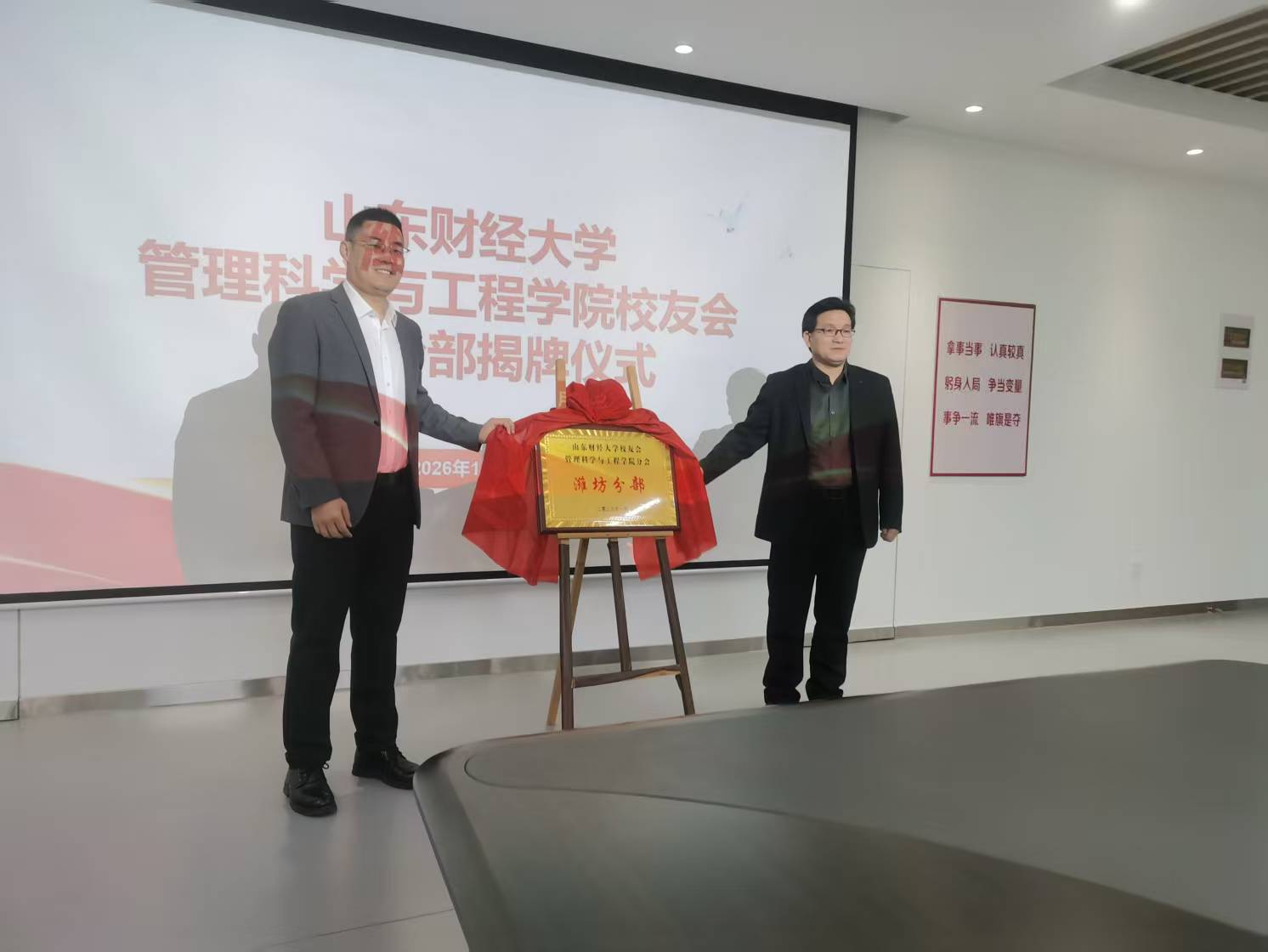1月20日,学院院长刘位龙,党委副书记刘思锋,副院长马建华、王洪海,学院学生(就业)工作办公室主任王桂月,学院合作交流中心主任刘强、副主任张正一行赴潍坊出席学院校友分会潍坊分部揭牌仪式,并指导当地校友会分部开展工作。山东财经大学潍坊校友会会长、北方联合会计事务所总经理李建军,学院校友分会潍坊分部部长、山东和智信息技术服务有限公司总经理葛长伟及部分在潍校友、部分在校生代表共同参与活动。