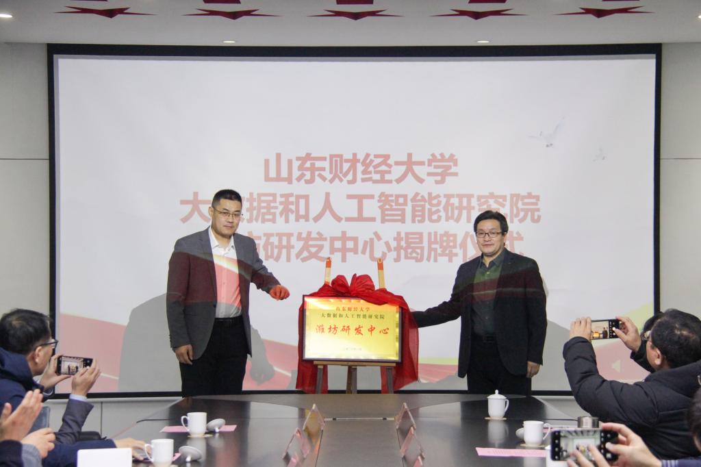 1月20日,山东财经大学大数据与人工智能研究院潍坊研发中心揭牌仪式在潍坊软件园举行。学院院长刘位龙,党委副书记刘思锋,副院长马建华、王洪海,学院学生(就业)工作办公室主任王桂月,学院社会合作和交流中心主任刘强、副主任张正参加活动。