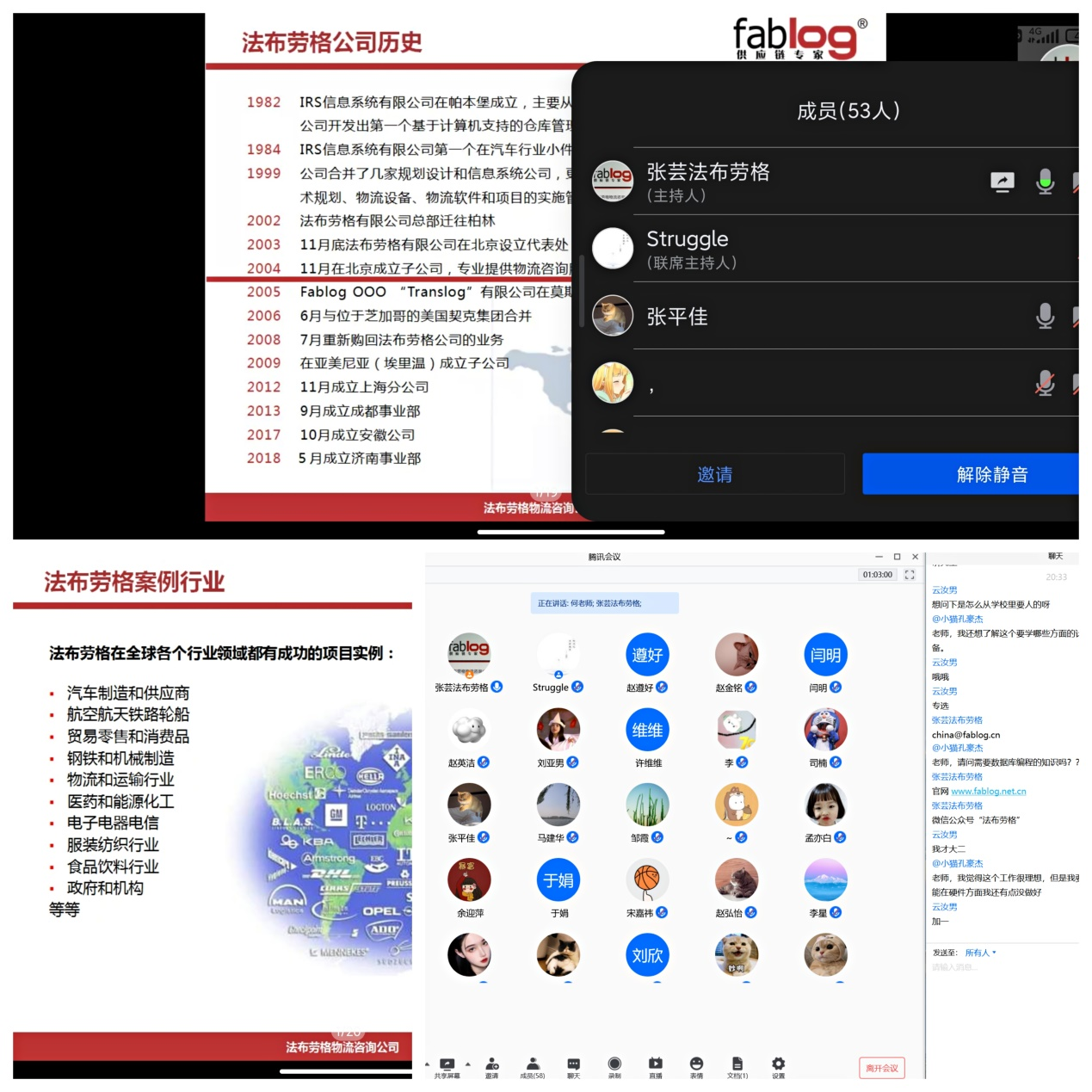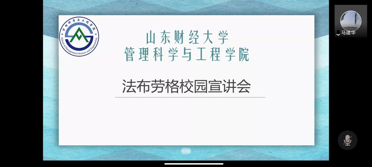 4月17日晚8点,法布劳格公司线上实习-就业宣讲会成功举办,宣讲会由我院MEM中心对外合作部部长邹霞老师主持,法布劳格物流咨询公司董事长张芸,济南事业部经理孟夏,我院副院长马建华,研究生辅导员何丽,物流工程管理专业研究生和部分本科生参加了此次会议。