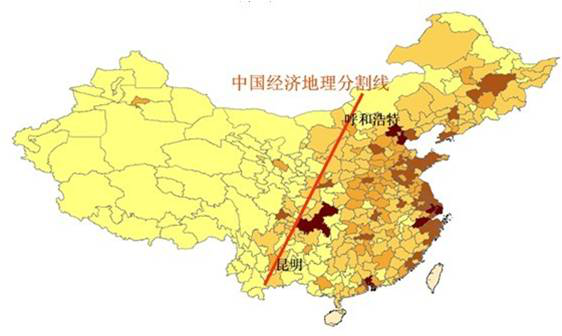 中国经济地理分割线,即从呼和浩特到昆明的连线,反映了我国经济密度的总体分布特征。该经济地理分割线以东的部分以占全国43%的国土面积,集中了全国88%的就业人数和全国91%的经济产值。从这张图,可以直观地反映我国区域经济发展严重失衡的问题。