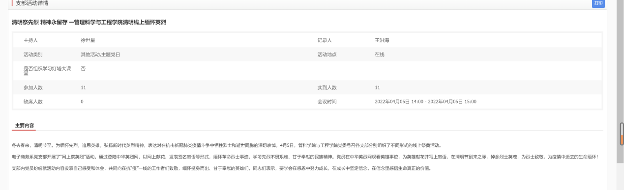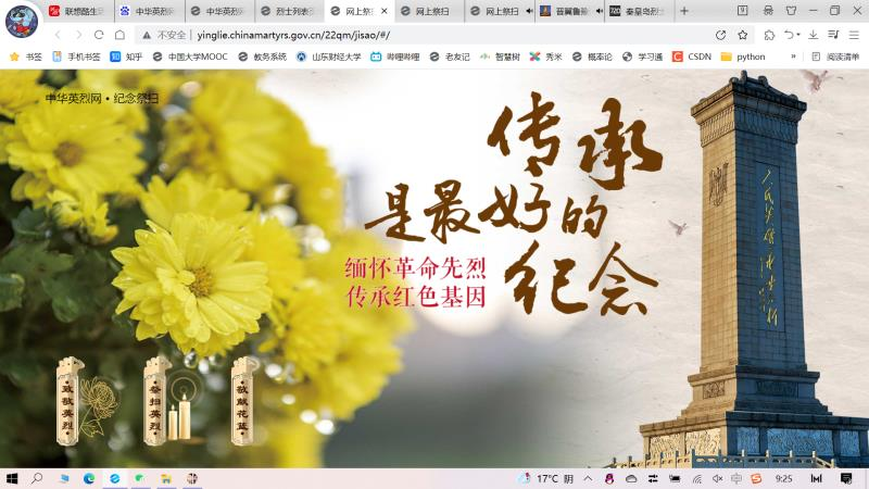 3.多个支部于清明节组织学习并进行了“清明祭先烈,精神永留存”清明线上缅怀英烈活动,追思英雄,弘扬新时代英烈精神,表达对在抗击新冠肺炎疫情斗争中牺牲烈士和逝世同胞的深切哀悼。支部党员及入党积极分子通过登陆中华英烈网,以网上献花、发表签名寄语等形式,缅怀革命烈士事迹,学习先烈不畏艰难、甘于奉献的民族精神。