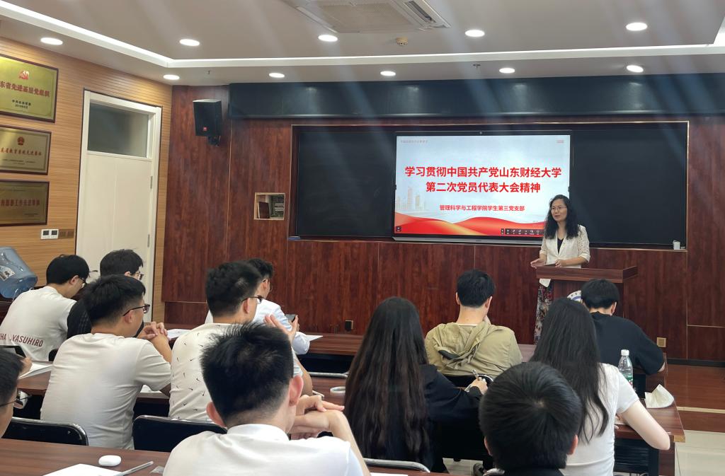 6月3日,管理科学与工程学院学生第三党支部组织全体党员学习山东财经大学第二次党代会精神,支部书记王桂月主持会议。