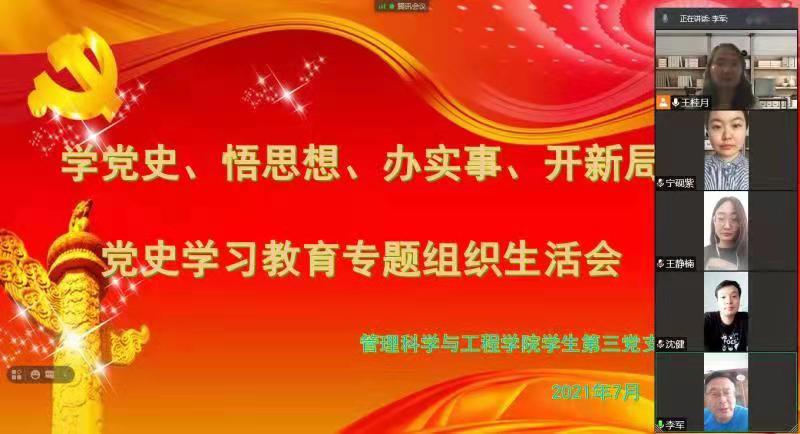 在精心准备的基础上,7月30日上午9时,管理科学与工程学院第三学生党支部于线上召开党史学习教育专题组织生活会,聚焦“学党史、悟思想、办实事、开新局”,查找不足、检视问题,开展批评与自我批评。学院党委书记李军、党支部书记王桂月、辅导员沈健及全体学生党员参加了会议。