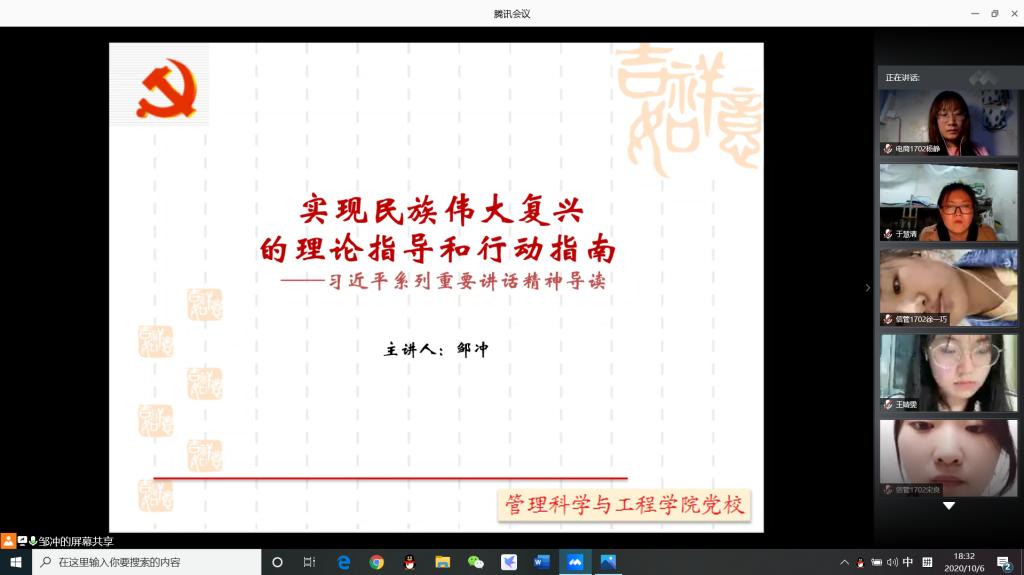 10月9日晚,我院2020年第一批发展对象圆满完成党院校培训课程。本次院党校培训课程共分两个阶段,理论学习阶段和现场教学阶段。理论教学阶段由2017级辅导员邹冲、满宠等主讲,以腾讯会议的形式进行网络授课。现场教学阶段将由院党委副书记朱翠珍、团委书记何丽等带队前往莱芜战役纪念馆等三地进行参观学习。