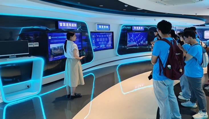 上午调研团队赴众阳健康科技集团考察。团队通过集团简介与发展历程了解了其在医疗信息化领域的定位。在数智化应用展区,重点考察了云计算平台、数据中台等技术的全链条布局。智慧医疗板块的数字孪生技术虚拟医疗场景,体现了一体化协同与快速交付;智慧医院案例则展示了系统如何优化挂号、缴费、报告查询等流程。