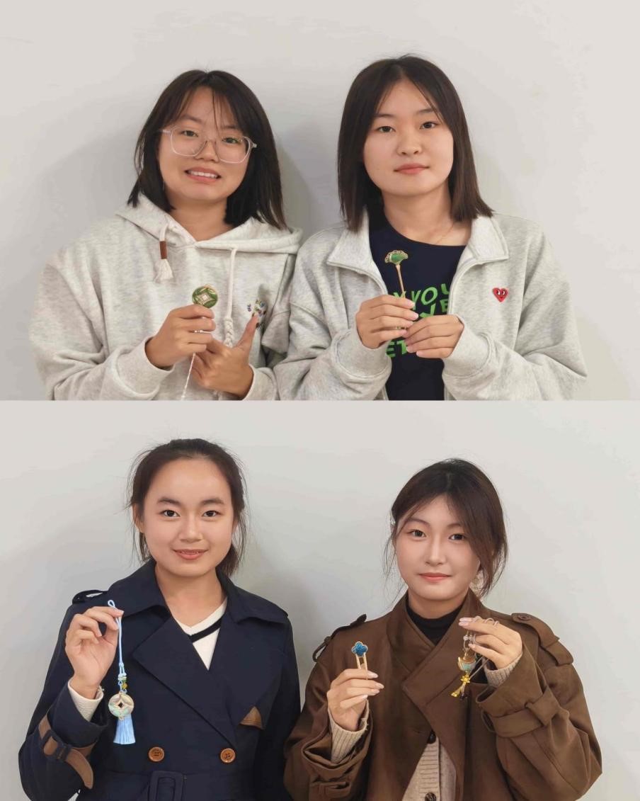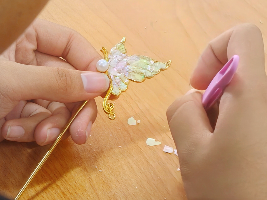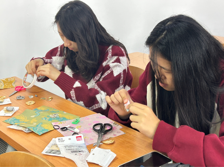 螺钿发饰与胸针制作活动则让同学们邂逅千年东方美学。活动中,大家近距离接触螺钿工艺,学习贝壳选料、裁切、镶嵌等核心技巧,在精细操作中将普通贝壳转化为璀璨精致的饰件。专注的创作过程不仅锤炼了同学们的动手能力与审美素养,更成为舒缓学业压力的有效途径。现场交流氛围轻松融洽,同学们在分享创作思路中结识同好,在传承非遗技艺中坚定文化自信。