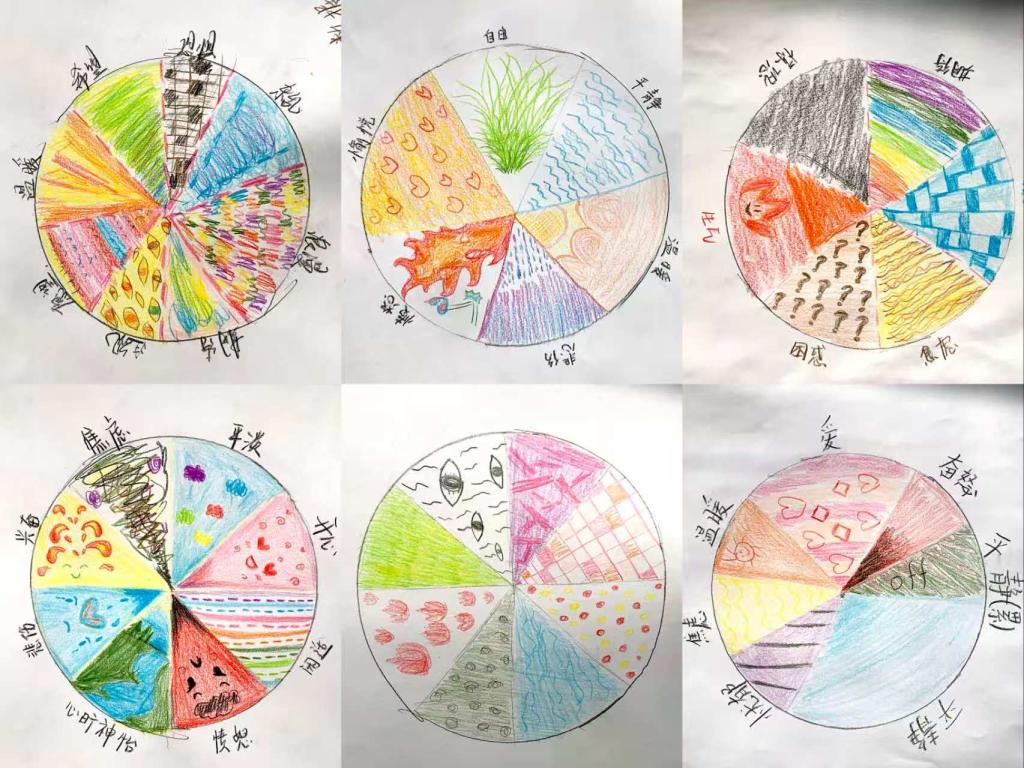 现场以“情绪轮盘”为核心,不同色彩对应各类情绪,同学们依据自身感受自由涂色,通过色块面积与饱和度清晰感知情绪占比与强度,在创作过程中完成自我觉察。安静的空间中只有画笔轻触纸面的沙沙声,同学们沉浸在自我关照的世界里,将心绪诉诸色彩。