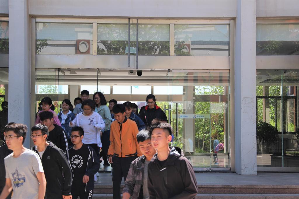 上午10:00,预警警报响起。安全引导员迅速在教学楼各疏散点集结到位,组织学生有序从教室内撤出。随后空袭警报与灾情警报响起,楼内所有师生员工在安全引导员的引导下有秩序的、小步快速地、贴近右侧楼梯向教学楼外疏散,进入预定疏散区域。解除警报响起后,演练活动顺利结束。在演练过程中,全校师生沉着冷静、反应迅速、听从指挥,整个过程快速、高效、有序。