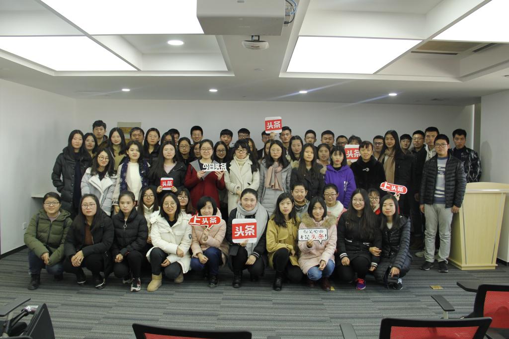 12月6日上午9点半,我院党委副书记徐世星、团委书记张贞梅、14级辅导员孙智凝带领各专业同学来到浆水泉路中润世纪锋1号楼的“今日头条”山东分公司进行参观学习。