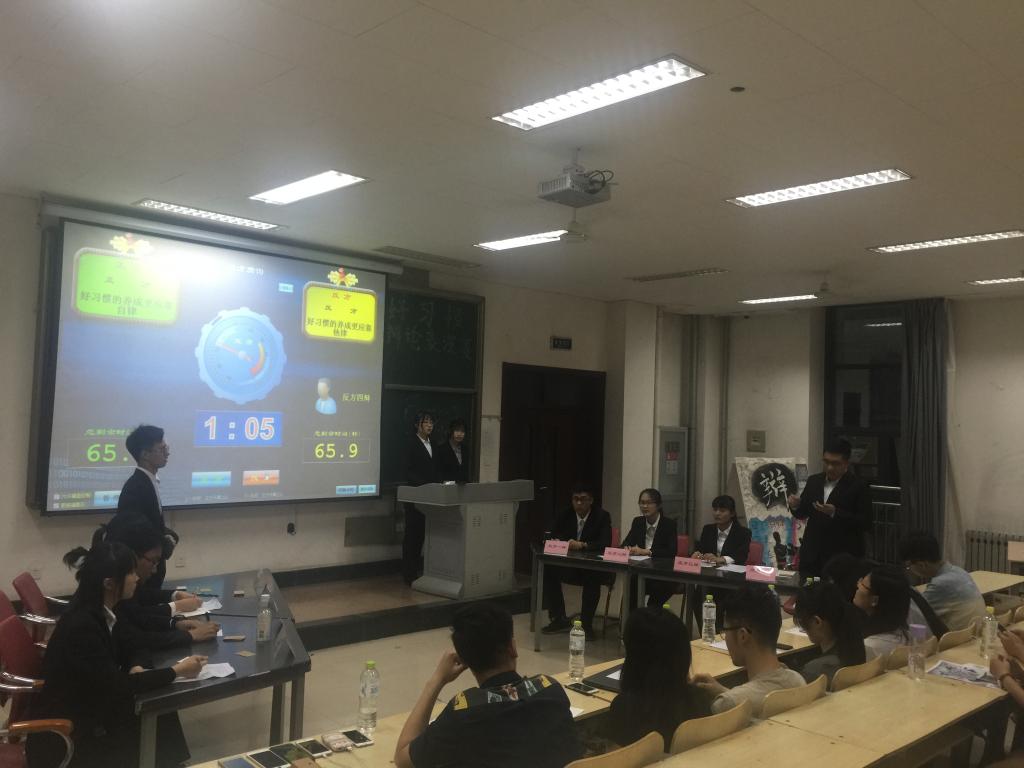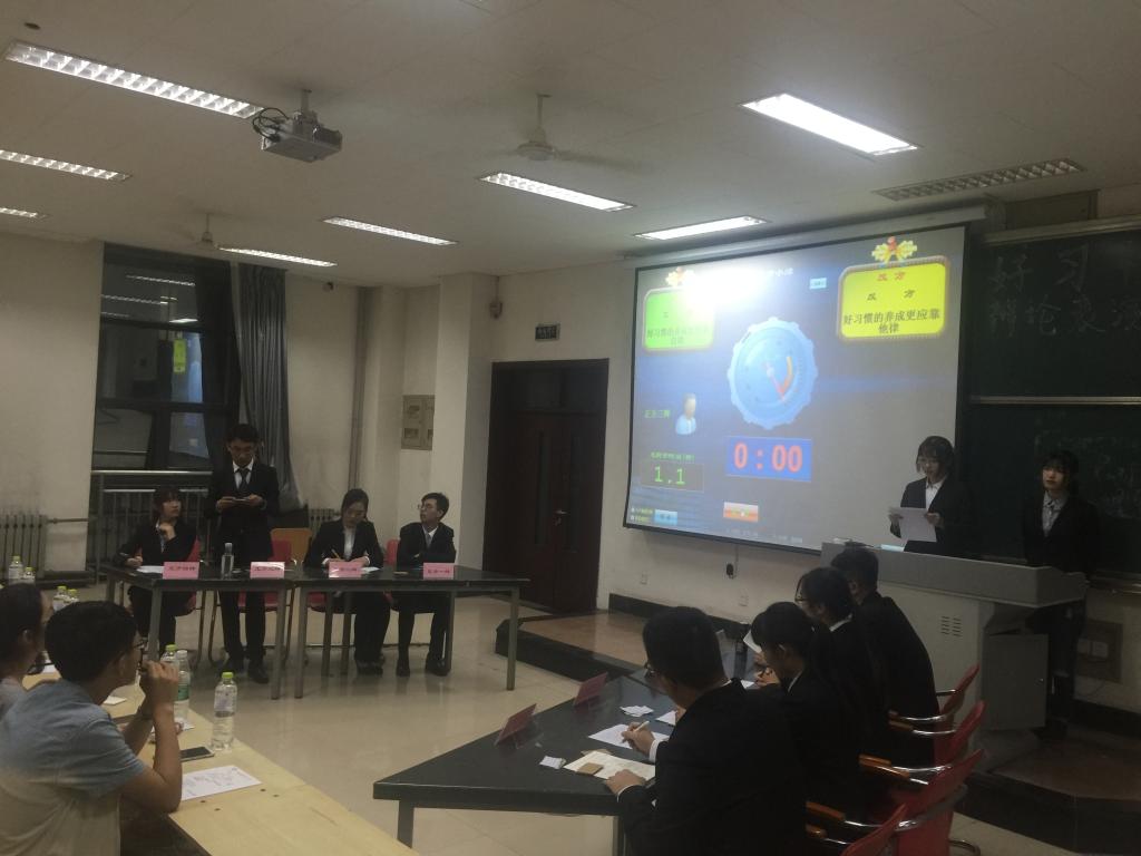 6月9日下午,由我院辩协主办的“好习惯的养成更应该靠自律还是他律”辩论表演赛于明水校区2211成功举行。本次表演赛邀请我院辩协主席马冰轮,副主席周颖、穆临风担任点评。近百名同学到场共同观看了比赛。