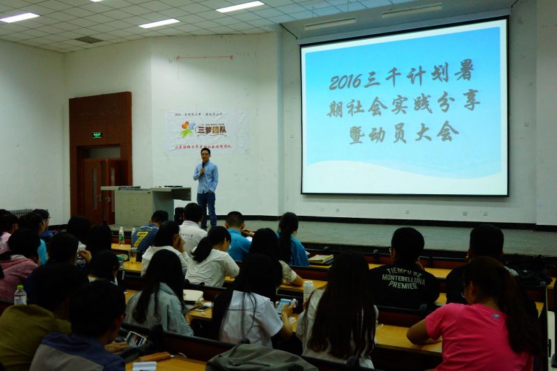 2016年5月13日晚6:30,“2016三千计划暑期社会实践分享会暨动员大会”在明水5201教室隆重举行。本次大会由樊庆臣主持,2015年管科院优秀社会实践团队“V-TOP团队”和“三梦团队”的队长田羽、王洪飞进行经验分享,2016年两团队新队长对活动进行展望,2014级2015级学生参与本次分享会的宣讲。