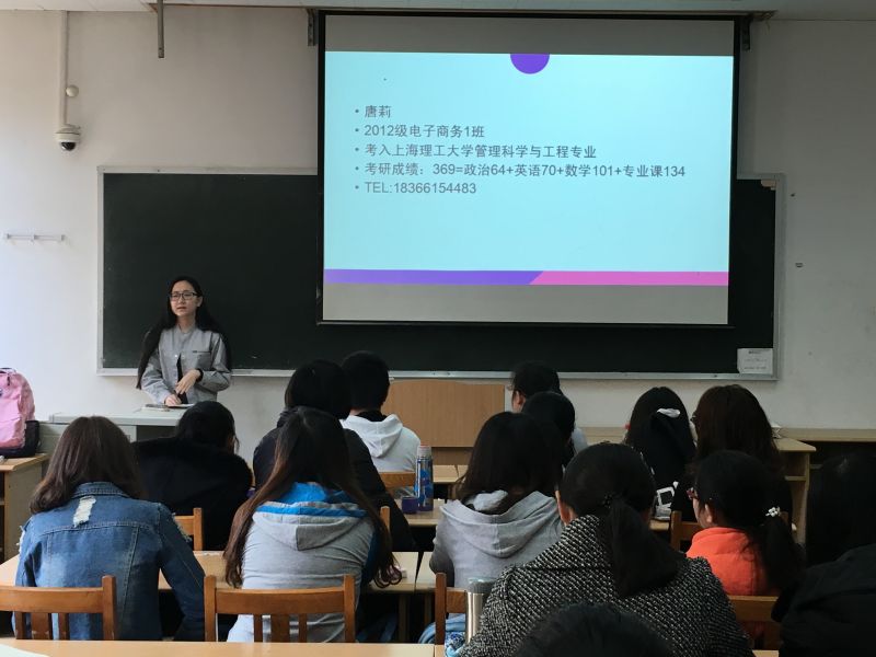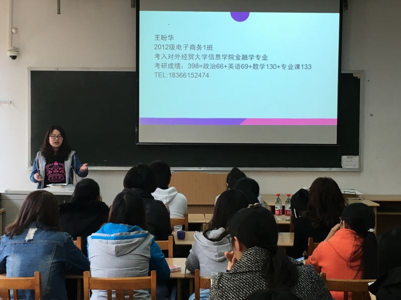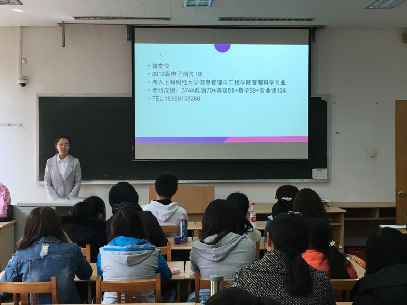 2016年3月31日上午,学院研究生考试经验交流会在燕山校区2203举行。交流会邀请2012级电子商务1班的王欠、王盼华、唐莉、郑文悦和2012级管理科学1班的谭浩主讲,辅导员周广春出席了此次交流会,2013级信息管理与信息系统1班全体同学及2013级信息管理与信息系统(服务外包方向)部分同学参加了交流。