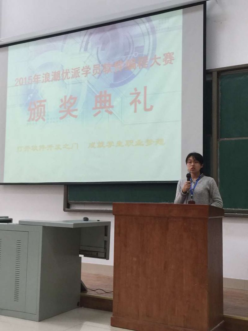 在颁奖典礼上我院刘娟同学作了发言。作为参赛学生代表,刘娟同学感谢了浪潮实训基地给广大同学们这一次难道的学习交流机会,分享了她学习编程的技巧及经验,介绍了她平时的学习安排以及未来规划。她巧妙的引用了韩愈的名言“书山有路勤为径,学海无涯苦作舟”来勉励大家刻苦学习,刘娟代表我院52实训名同学向在座老师表示了感谢。基地负责人做了总结性发言,从大赛内容,大赛意义,以及师资教学等方面客观的做出评价,希望同学们努力学习好专业知识,为步入社会打下坚实的基础。