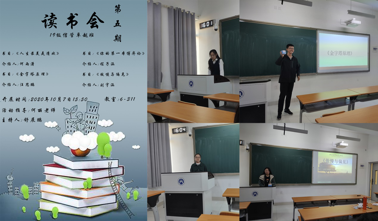 10月7日下午3点50分,我院2019级信息管理与信息系统(大数据与商务分析)卓越创新班如期开展了第五期读书会。我院团委书记何丽参加了本次活动,何雨潇、汪思鹏、程子涵、刘宇涵四位同学分享了自己的读书心得,本次读书会由舒展鹏主持。