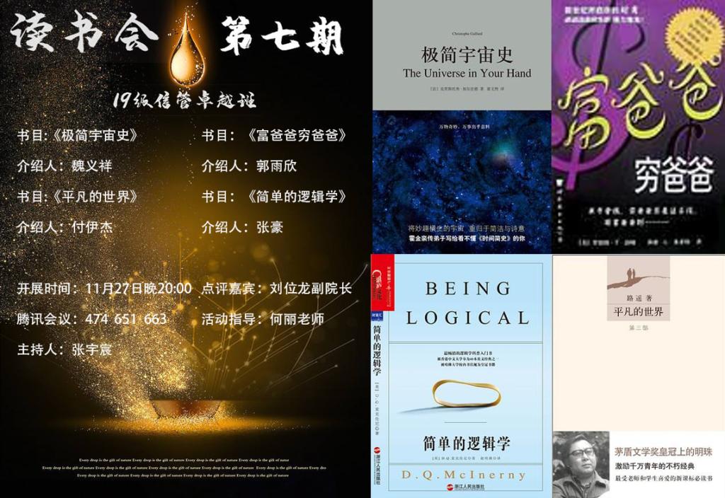 11月27日晚8点,我院2019级与2020级信息管理与信息系统(大数据与商务分析)卓越创新班共同开展了第七期线上读书会,我院副院长刘位龙,院长助理王洪海、团委书记何丽以及2020级创新班班主任徐德英参加了本次活动。2019级创新班魏义祥、郭雨欣、付伊杰、张豪四位同学分享了自己的读书心得。本次读书会由2019级创新班张宇宸同学主持。