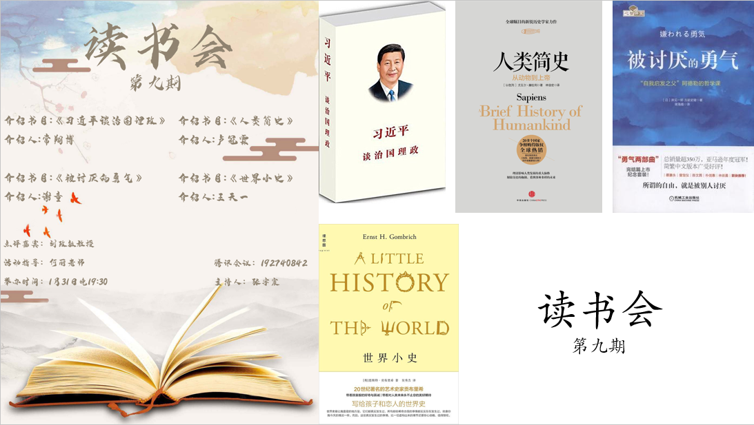 首先,常翔博分享了红色书籍《习近平谈治国理政》。2021年是“十四五”的开局之年,同时,也是建党一百周年,作为大学生,将国家的宏观发展进程和自身的未来规划融合在一起是同学们的使命。然后,卢冠霖给同学们介绍了《人类简史》这本书,这本书以不到500页的篇幅,从10万年前一直讲到了21世纪,为读者理清人类的发展脉络提供了一个充满哲思的全局视角。接着,谢童分享了一本心理学入门书《被讨厌的勇气》,书中阿德勒否定了弗洛伊德对个人历史的解读,强调个人可以获得自由、赋予自己生命的独特意义。决定自身的不是过去的经历,而是我们自己赋予经历的意义,生命是连续的此时此刻,没有别人会为你改变世界,除了你自己。最后,王天一通过《世界小史》一书告诉同学们,在巨大的时间洪流里,我们小之又小,一直会有新的、更新的东西出现。我们称之为命运的东西,无非是为自己这颗水滴在浪花上的一次升落而进行的挣扎。但是,即便这只是一个瞬间,我们也要利用好,因为它值得我们花费力气。