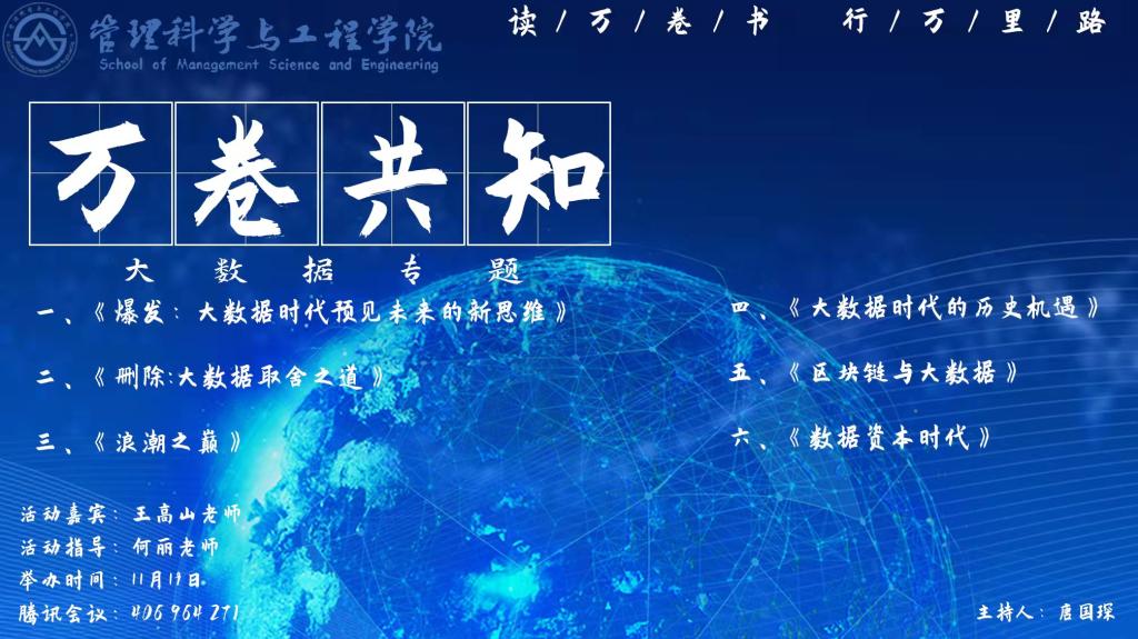 11月19日晚上8时30分,我院2019级信息管理与信息系统(大数据与商务分析)卓越班成功开展了第十四期读书会。我院教授、硕士生导师王高山和团委书记何丽参加了本次活动,本次介绍分为6组,共18位同学,依次分享了自己的读书心得,本次读书会由唐国琛主持,2019级卓越班全体同学参加了此次活动。