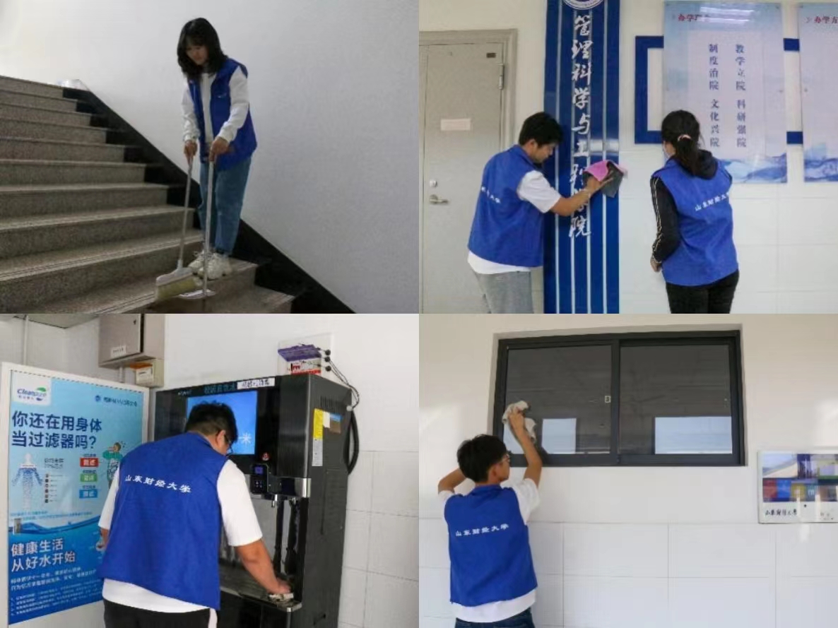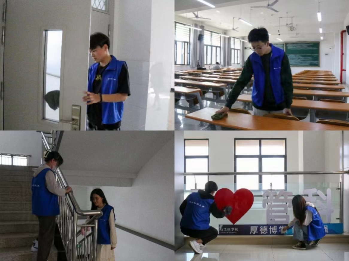 在清扫校园活动中,同学们走进教学楼,不放过本院内的一砖一瓦,擦拭窗台、清理显示屏、清理楼梯及扶手。除此以外,同学们还抽出课余时间走进教室,擦洗黑板、清理课洞垃圾、擦拭桌椅等,用行动践行雷锋精神。