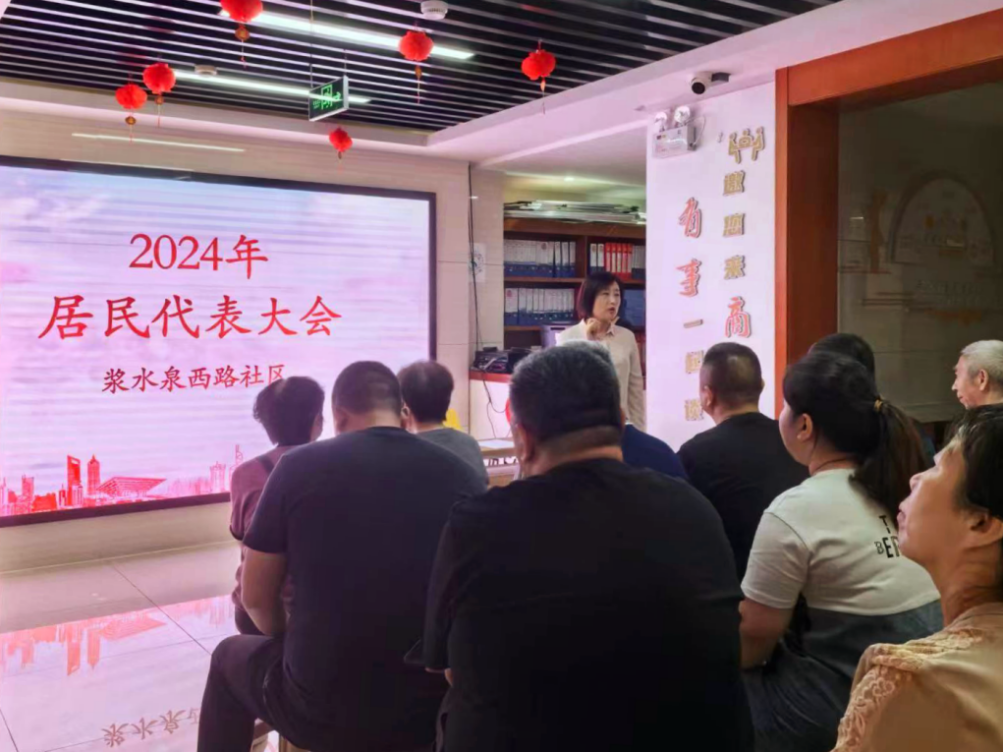 7月9日,在洪志娟老师和祝翠玲老师的带领下,团队再次来到浆水泉西路社区进行深入调研,通过问卷调查采集定量数据。本次问卷数据采集是当日社区居民代表大会的最后一项议程,深度嵌入居民与居委的沟通交流。高书记在会议中强调,社区的建设与发展离不开居民的积极参与,特别呼吁居民参与到社区智慧化建设中来,为社区的发展建言献策,携手打造更加美好的社区环境。调研团队在大会的最后阶段,向居民代表发放了调查问卷,旨在深入了解居民的社区生活,特别是他们对智慧化社区建设的看法和需求。通过与居民代表交流,团队发现社区居民普遍支持社区智慧化建设,期待社区能够依托人工智能技术,实现智慧化、信息化、便民化的发展,但希望社区智慧化的建设能够更具有针对性,能够切实解决社区中存在的痛点问题。在调研过程中,团队也注意到社区居委会在维护居民权益、关爱弱势群体、组织社区活动等方面发挥的重要作用。居委会秉持“和谐、稳定、发展”的原则,积极宣传社会主义核心价值观,引导居民树立正确的世界观、人生观、价值观。