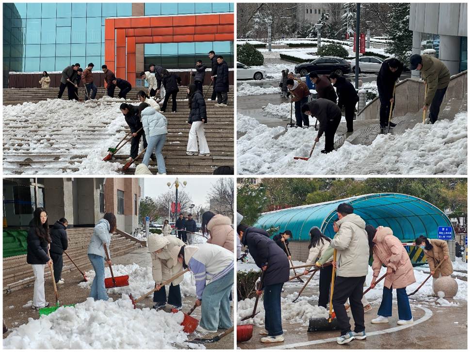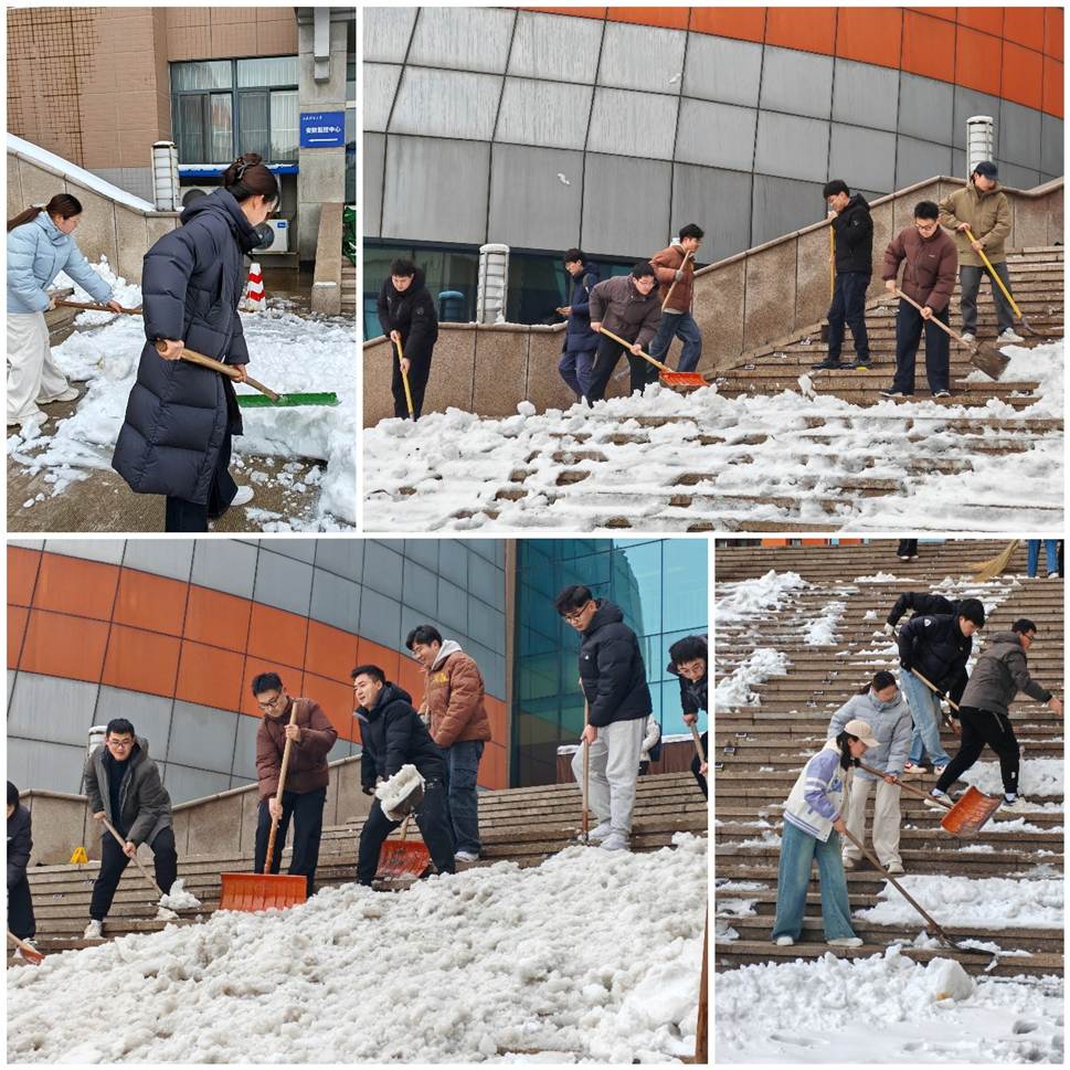 活动伊始,研究生党支部书记何丽对清扫区域进行了分工安排。尽管天气寒冷,积雪因踩踏凝结成冰,清理难度较大,但党员和入党积极分子仍以高度的热情,手持铁锹、雪铲等工具,采取“分组包干、协作推进”的方式迅速投入到了工作中。经过近两个小时的团结协作,逸夫楼、图书馆台阶及门前主干道等区域的积雪被基本清除,为师生开辟出安全通道。