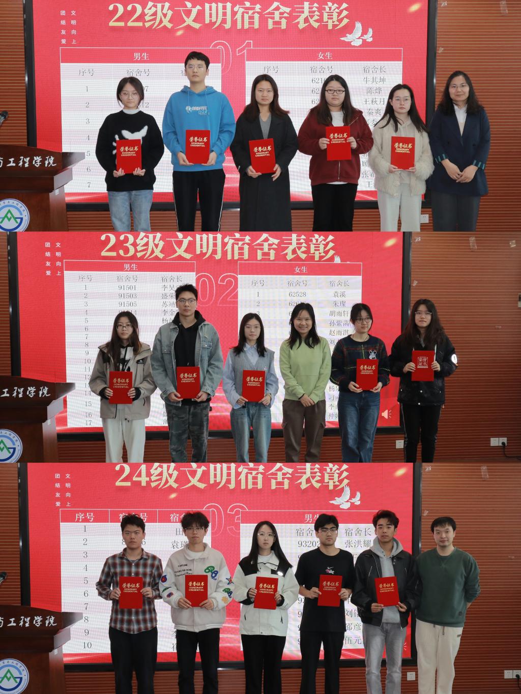 会上,学工(就业)办主任王桂月宣读获奖宿舍名单,对在宿舍文明建设中表现突出的67间“院级文明宿舍”予以表彰。学院领导老师分别为22级、23级、24级获奖宿舍代表颁发荣誉,肯定他们在宿舍管理工作中的贡献,激励全体学生向榜样学习,营造出浓厚的争先创优氛围。