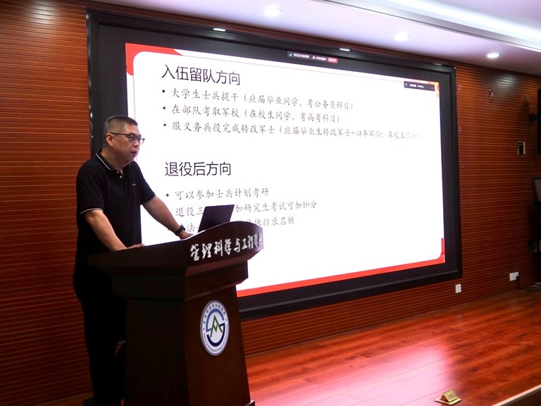 分享会上,孙智凝老师围绕大学生征兵工作,详细介绍了报名时间、对象范围、基本条件、入伍流程和优待政策等内容,强调了参军入伍对个人成长和国家建设的重要意义,鼓励同学们积极报名,为国防事业贡献自己的力量。