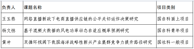近期国家自然科学基金和国家社科基金先后公布2023年度立项项目,管理科学与工程学院共获3项国家基金项目立项,其中王玉燕教授的《网络直播新政下电商直播供应链的公平关切运作决策研究》获得国家自然科学基金面上项目立项资助,杨文栋博士的《基于混频大数据的风电功率动态自适应概率预测研究》获得国家自然科学基金青年项目立项资助,黄冲博士的《双循环视阈下我国海洋战略性新兴产业集群竞争力提升路径研究》获得国家社科基金一般项目立项资助。3项国家基金项目的立项可以提升我院科研水平,助力学科建设。