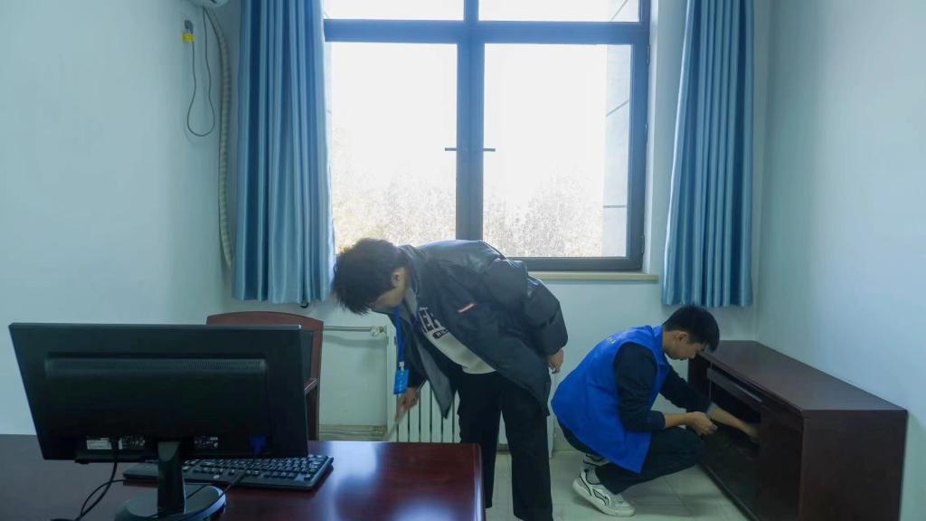 清扫过程中,同学们分工明确,团结协作,分别对办公室、会议室等场所进行了全面彻底的清洁工作。他们身着蓝色志愿者制服,手里拿着扫帚、垃圾桶、拖把、抹布等卫生工具,以积极的态度和饱满的热情踊跃投入到卫生工作中。最终,经过大家的不懈努力,圣井校区教学六号楼被打扫得一尘不染,焕然一新。
