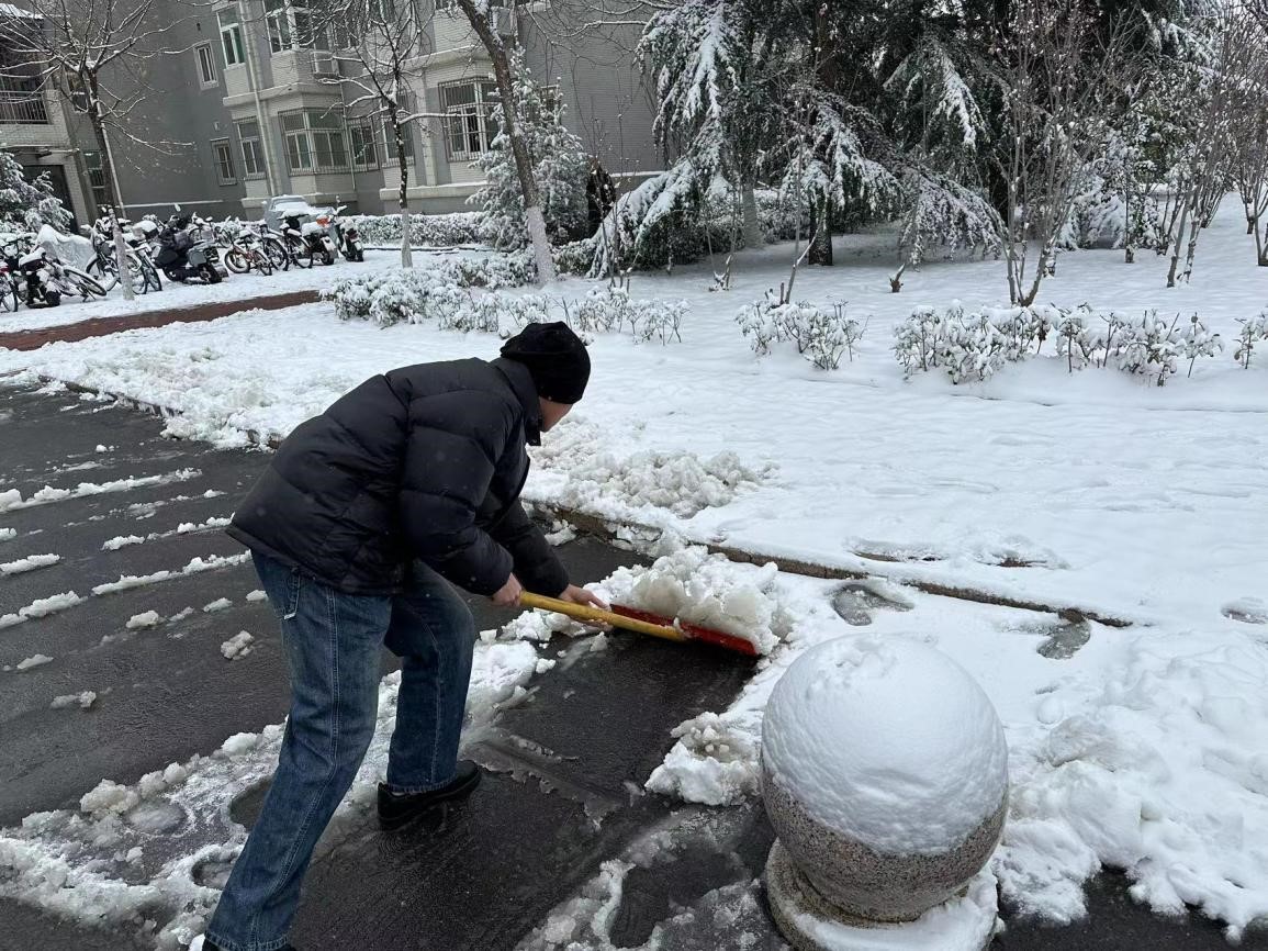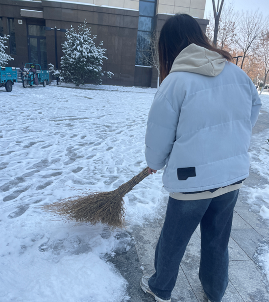 虽然冰雪经过车辆碾压与行人踩踏,已经牢牢附着在地面上,但同学们工作的热情和效率丝毫没有受到影响。同学们在学生干部以及党员的组织下有序分工、默契配合,利用借来的雪铲等除雪工具争分夺秒地铲除了宿舍楼下影响出行的积雪和暗冰,用最朴实的劳动为大家的出行安全增添了一份保障。