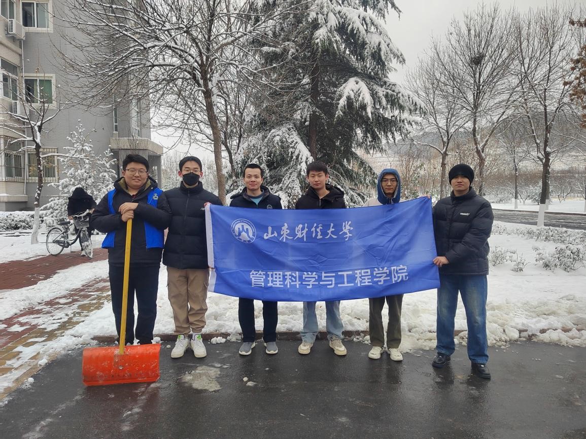 大雪纷飞、寒风凛冽。为在保障师生出行安全的同时发扬志愿精神、提升班级凝聚力,12月11日,管理科学与工程学院物流管理2101班开展了一次以“冬日献温暖,我们在行动”为主题的志愿扫雪活动。本次志愿服务活动由物流管理2101班班长和团支书分别带领班级同学在男生宿舍5号楼以及女生宿舍8号楼下进行。