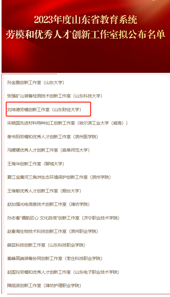2023年12月,山东省教育工会委员会公布了“2023年山东省教育系统劳模和优秀人才创新工作室”名单,全省教育系统共有16家创新工作室入选,我院 “刘培德劳模创新工作室”榜上有名。