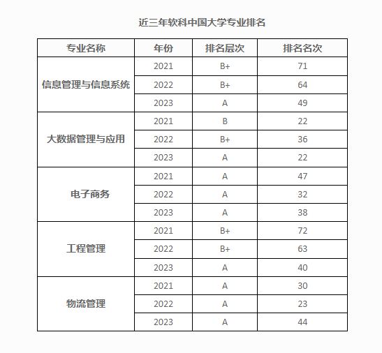 2023年11月8日,软科发布“2023中国最好学科排名”,我院管理科学与工程学科排名持续攀升,排名全国高校第25位,居全国前12%,位列全国财经院校第二位、省内高校第一位,学科排名实现了历史性突破,学科综合实力得到充分认可。同时,在“2023软科中国最好专业排名”中,我院信息管理与信息系统、电子商务、物流管理、大数据管理与应用、工程管理5个本科专业均为A等级,列省属高校第1位。