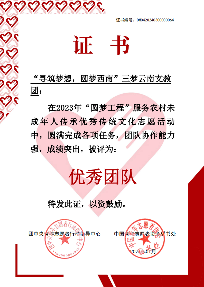 近日,由中央文明办三局、团中央青年志愿者行动指导中心、中国青年志愿者协会秘书处共同开展的2023年“圆梦工程”服务农村未成年人传承优秀传统文化志愿服务项目发布全国优秀团队评选结果,我院“寻筑梦想,圆梦西南”三梦云南支教团在638所高校和72个地方青年志愿者协会的两千余支志愿服务队伍中脱颖而出,成为全国200支“优秀团队”之一。