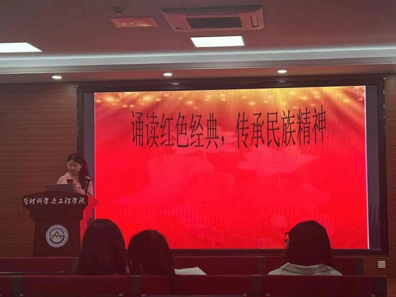 为了进一步增强团员青年的责任感、使命感和紧迫感,强化同学们爱国爱党爱校情怀,营造良好的校园文化氛围,引导青年学生铭记历史,2023年4月22日,管理科学与工程学院于圣井校区6432教室开展了红色经典诵读活动。本次诵读活动,同学们在品味红色经典盛宴的同时也领略了红色文化的魅力,加深了同学们对历史的学习领悟,诠释了红色精神的实质,进一步坚定了当代大学生作为新时代青年的使命与担当。历史的车轮在转,红色经典传承的重任又落在了我们的肩上,希望我们有能力唤起红色经典,燃烧激情岁月,创造别样的辉煌。
