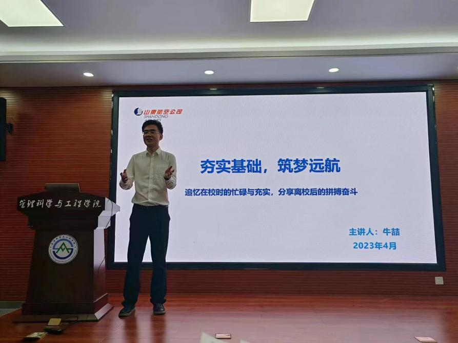 2023年4月20日下午,我院邀请优秀校友、山东航空公司牛喆,在圣井校区6432报告厅举行了以⟪夯实基础,筑梦远航⟫为主题的讲座。本次讲座由学工办主任王桂月主持,20、21和22级部分学生代表参加此次讲座。