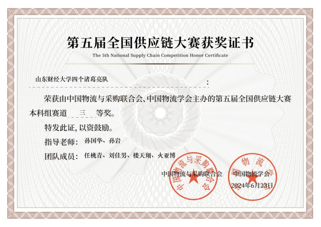 2024年6月23日,第五届全国供应链大赛落下帷幕,我院“山东财经大学四个诸葛亮队”在此次比赛中荣获三等奖。