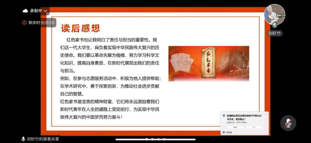 大数据2201班刘轩竹同学分享的书籍是《红色家书》。这本书中收录了五十余封共产党员的家书,这些家书中蕴藏着一段段血泪交织的感人故事,饱含着共产党人愿为信仰而献身的豪情壮志。阅读这些红色家书,让我们擦亮了信仰,明确了担当,鼓足了力量,将个人的小生命,融入党和国家伟大生命的洪流。