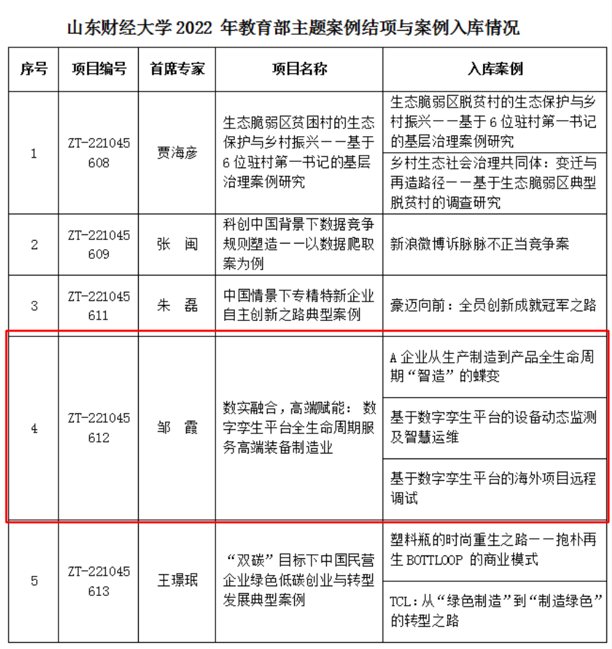 2024年10月,教育部学位与研究生教育发展中心发布了《关于2022年度主题案例项目结项验收的通知》。经审核评议,学院邹霞副教授承担的中国专业学位案例中心主题案例项目《数实融合,高端赋能:数字孪生平台全生命周期服务高端装备制造业》顺利结项。同时,依托项目开发撰写的3个案例均已通过评议,后续按程序收录进入中国专业学位案例中心案例库,为全国高校及教师开发案例、研究案例、运用案例教学提供参考。