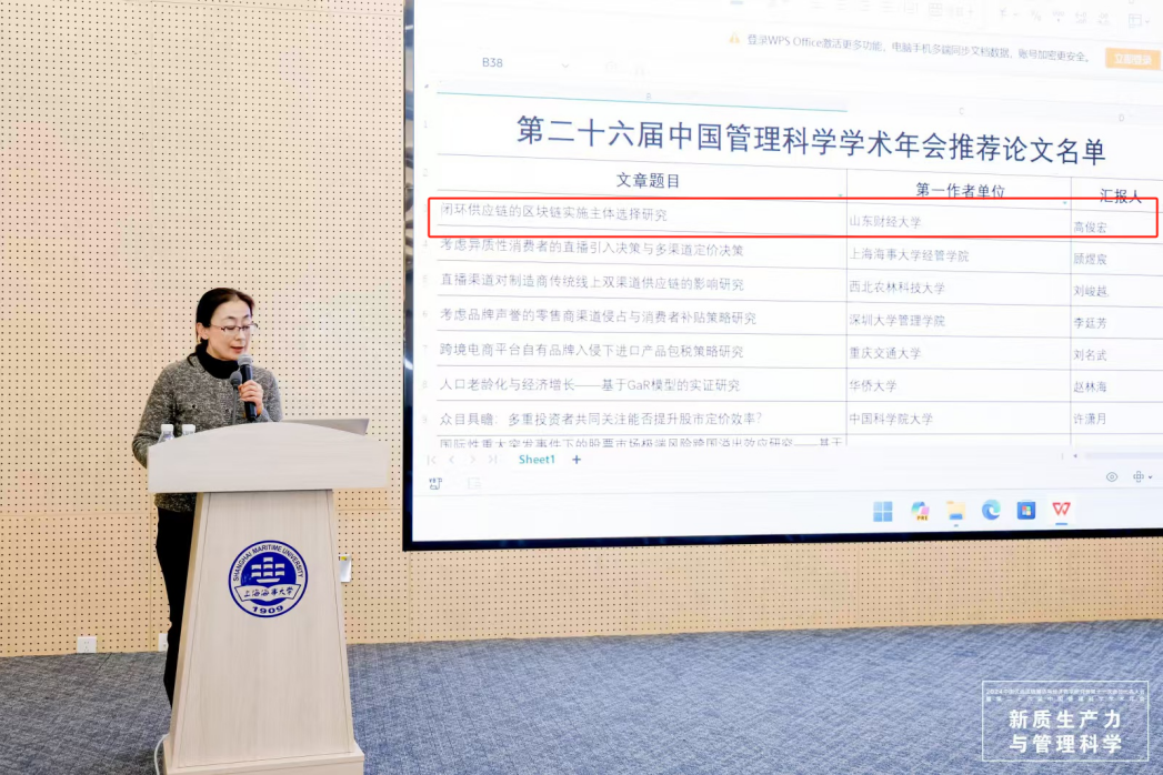2024年11月22-25日,中国优选法统筹法与经济数学研究会第十一次会员代表大会暨第二十六届中国管理科学学术年会在上海海事大学举办。学院王玉燕教授与博士生高俊宏撰写的论文《闭环供应链的区块链实施主体选择研究》获评第二十六届中国管理科学学术年会推荐论文奖。此次大会邀请了包括中国工程院院士杨善林、陈晓红、唐立新在内的300余名知名专家,来自全国200余所高校和科研院所的近千名代表参加了本届年会。本届年会以“新质生产力与管理科学”为主题,设置了8场大会特邀报告和6场论坛,并围绕6个专题设17个平行分会场对234篇论文进行研讨和评审,最后评选出33篇推荐论文,该论文为推荐论文之一。