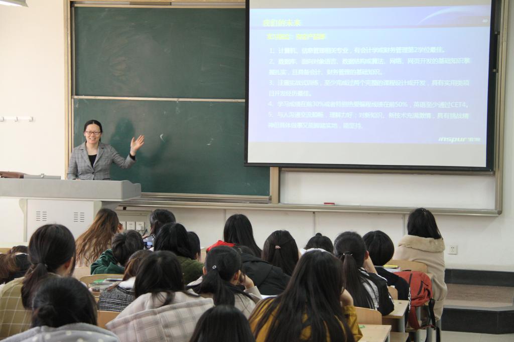 李芳以“预见未来遇见你”为主题来回忆自己毕业18年以来从入职、定岗顾问到参加大项目的多彩职业旅途,主要强调综合素质及专业的重要性。她提出,同浪潮集团一样,大多数集团选择人才的标准仍然是坚实的专业基础、良好的团队精神和持续的学习能力。她提醒我们要主动学习,主动创新,主动变革和进取。在座谈会的最后,李芳和在场女生进行了交流互动,强调女生要关注自身思想素质,道德修养及文化内涵。