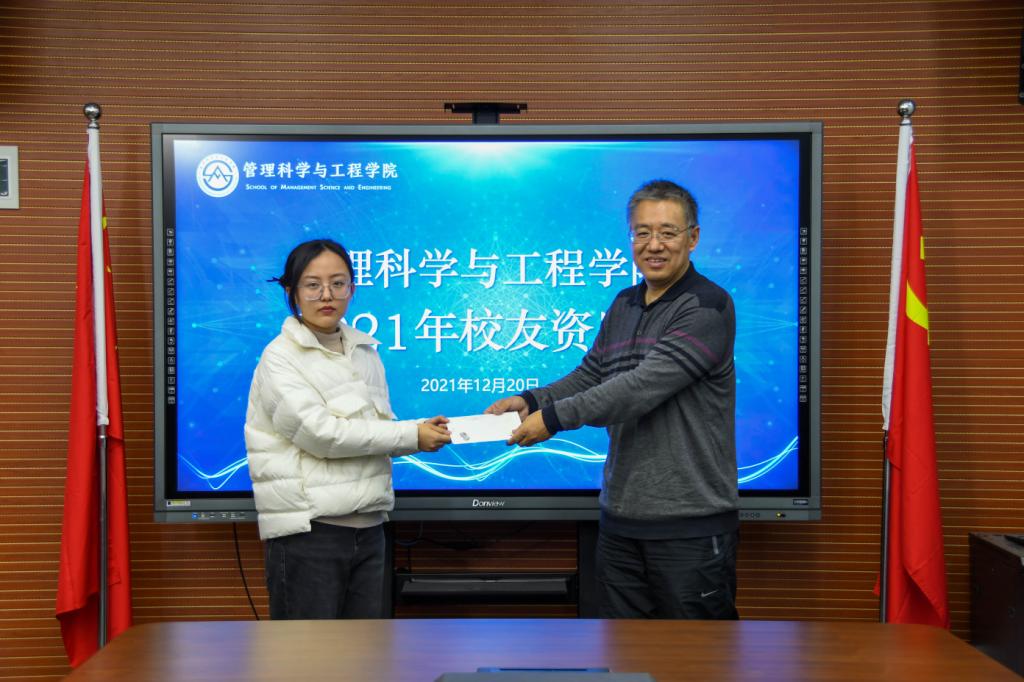 “91信息校友助学金”由山东财经大学管理科学与工程学院91级经济信息管理专业校友发起,旨在奖励、资助品学兼优目有一定困难的管科院全日制本科生。该奖学金的设立体现了校友们的对母校的关心与对学生的无私爱心,在学院培养高素质、创新型人才过程中发挥了积极的作用。本次仪式旨在鼓励学生以优秀校友为榜样,向优秀校友学习,心怀感恩、艰苦奋斗、提升自我,为将来报效祖国打下坚实基础。