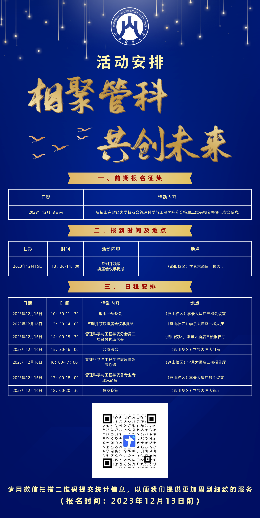 为进一步加强管理科学与工程学院分会建设,让校友会的建设工作在新一届成员中得到传承与发展,根据山东财经大学校友会管理科学与工程学院分会章程,经山东财经大学校友总会批准,兹定于2023年12月16日举办山东财经大学校友会管理科学与工程分会换届大会,我们诚邀您拔冗莅临,纵挥凌云笔,共话新征程,携手书写未来佳绩!