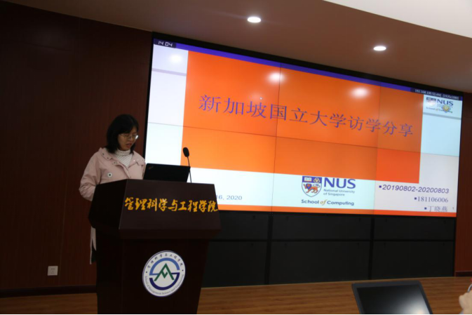 丁晓燕同学于2019年8月2日-2020年8月3日赴新加坡国立大学进行为期一年的访学。交流会上,丁晓燕同学从前期准备、访学学习与生活、个人思考与体会等四个方面展开汇报交流。丁晓燕结合自身在新加坡的交流学习经历,重点讲解了新加坡信息系统博士生研究领域现状、研究生怎样做好科学研究以及如何写好博士论文,展现了新加坡国立大学浓厚的学习氛围。18级董明广、刘喜全两位同学则是通过分享自己在韩国又松大学访学的课程学习、文化体验经历提醒同学们正确认识访学项目的目的,访学期间做好时间管理,养成良好学习习惯,保证身体健康。
